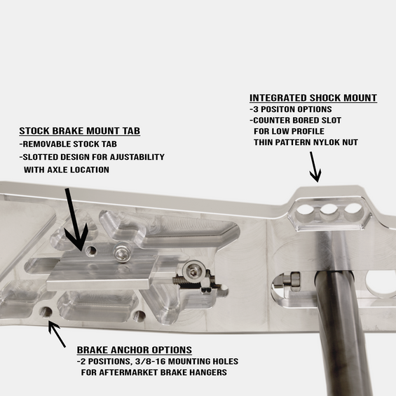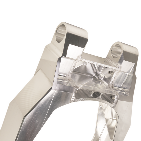 - 3 piece CNC machined aluminum design featuring a bolted, pinned, and welded assembly.