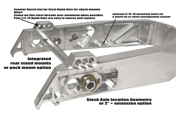 - *FLT Swingarm bearing Spacers: These will need to be Loctite into the swing arm bearing pivot tunnel. These will allow proper fitment of FLT, bearings as needed.