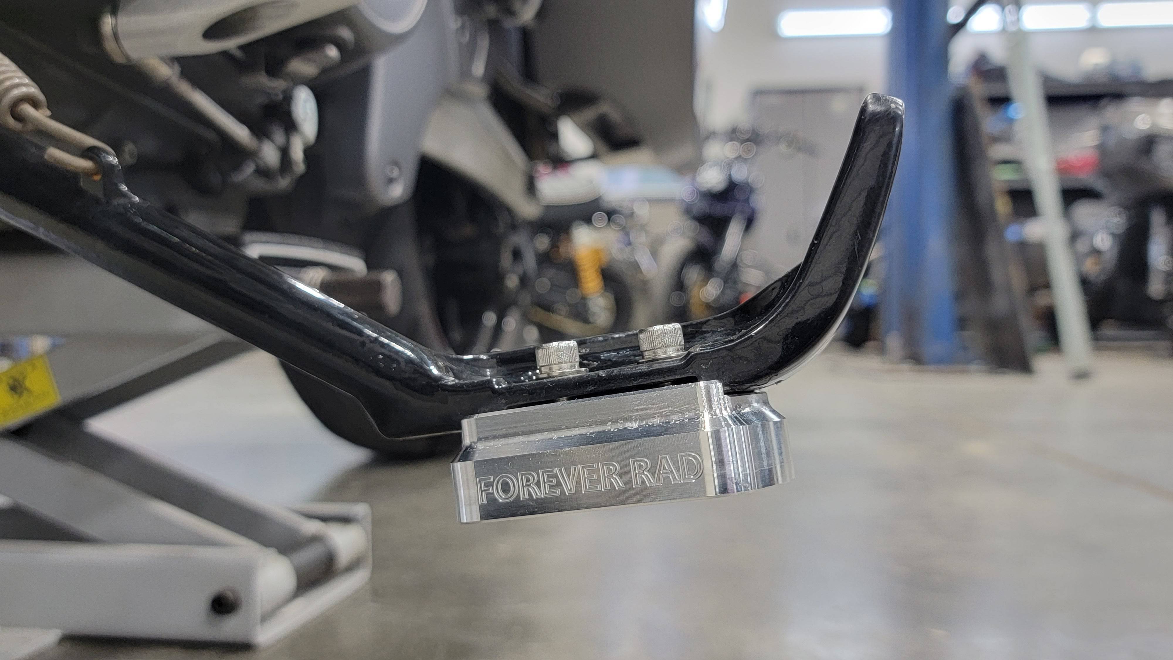 This kickstand block is the perfect solution for your Challenger after lifting your bike. Made of solid aluminum in the USA. 3/4" thick and will help lean angle after lifting your Challenger, while also promising to last a lifetime! This block will work with a 1" and 2" lift, and can also work with stock height applications for those who desire less lean angle.