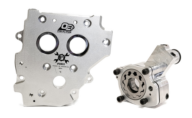 FEULING OE+ oil pump and camplate kits are an upgrade to the stock oiling system, delivering increased oil pressure and return scavenge volumes from an OE+ billet oil pump and matched OE+ billet camplate. The OE+ billet camplates have increased rigidity and are machined to tighter tolerances compared to stock. The OE+ camplate pressure relief valve and spring are seated and pre-set with a 50-60 psi pop off.
