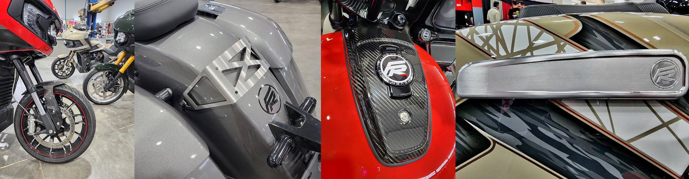 Selection of Premium Carbon Fiber and Body Parts: Including the Forever Rad FTR Front Fender conversion for Indian Challenger/Pursuit/Sport Chief, saddlebag hinge covers, saddlebag tethers for Indian Challenger, Chieftain, Springfield, and the DTF True Carbon Fiber Indian Challenger smooth rear fender. These parts not only enhance the bike's appearance but also contribute to performance by reducing weight.