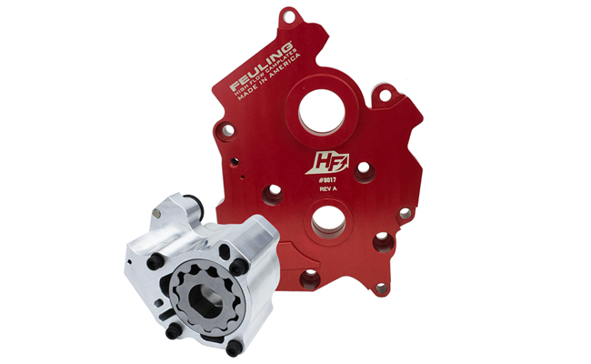 Both HP+ and RACE SERIES kits include FEULINGS HIGH FLOW billet camplate made from 7075 aluminum which is 50% harder and stronger than the factory or Feuling OE+ camplates. FEULING increases oil flow and volume by enlarging the oil pump reservoirs and critical oil passages including matching the oil port holes throughout the camplate to the port holes in the engine case which increases engine oil flow to the lifters, piston cooling jets, crankshaft and rod bearings.