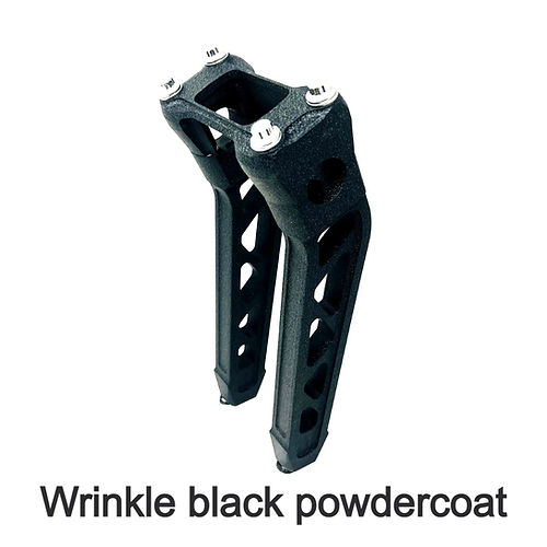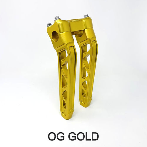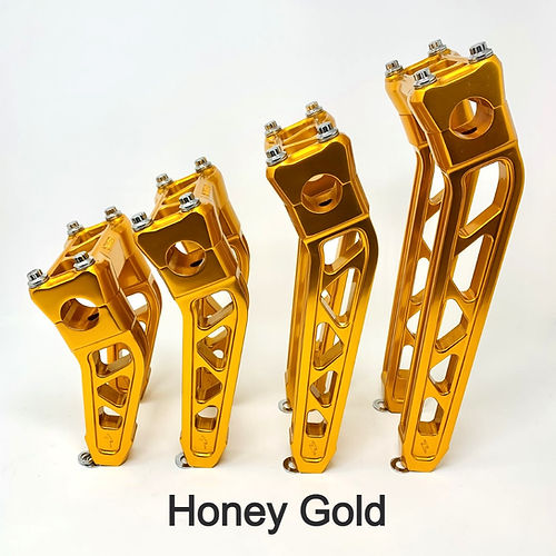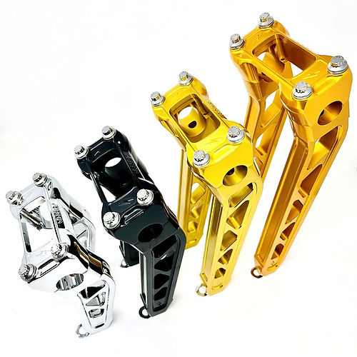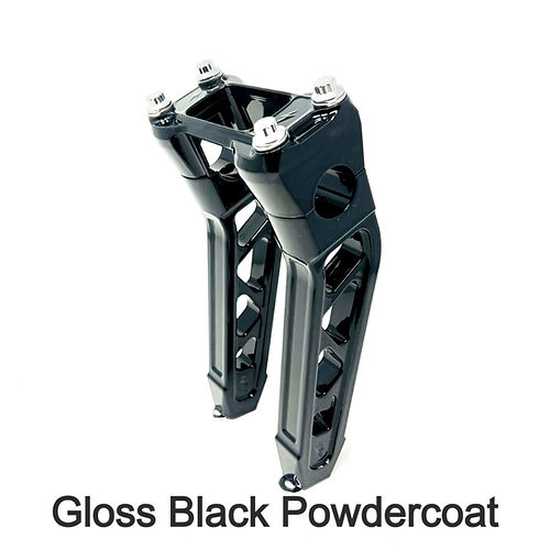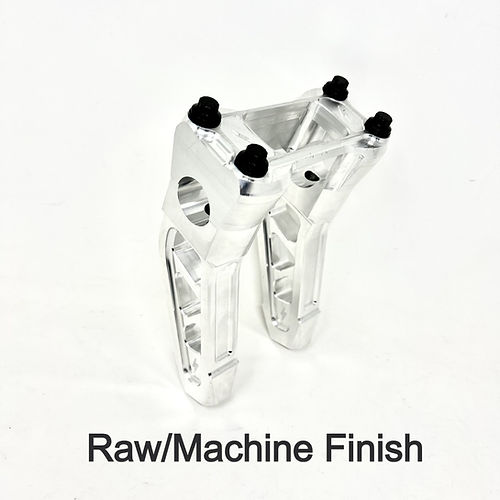 El espacio entre los orificios de montaje del elevador inferior es el estándar Harley de 3-1/2". El espacio entre los pernos de la abrazadera superior funciona con soportes de calibre estilo OEM de 4-1/4". Están disponibles en una variedad de colores anodizados, cromo, recubrimiento en polvo y acabado a máquina. El acabado a máquina puede tener pequeñas imperfecciones propias del proceso de mecanizado y no haber sido alisado ni pulido, sólo desbarbado. Está destinado a ser recubierto y terminado por el cliente, pero puede ser scotchbrit o funcionar tal cual.