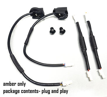 Amber is plug-and-play (connectors preinstalled), while solder sleeves are included for the white/amber. For white/amber, separate polarity converters are required