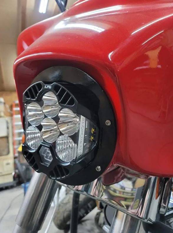 Soporte de deslizamiento Street Glide de Baja Designs de rendimiento anterior. Soporte de acero cortado con láser de primera calidad, soldado a mano y recubierto de polvo. Se adapta a la luz LP6 de Baja Designs. Funciona con el panel de relleno Lucky Strike.