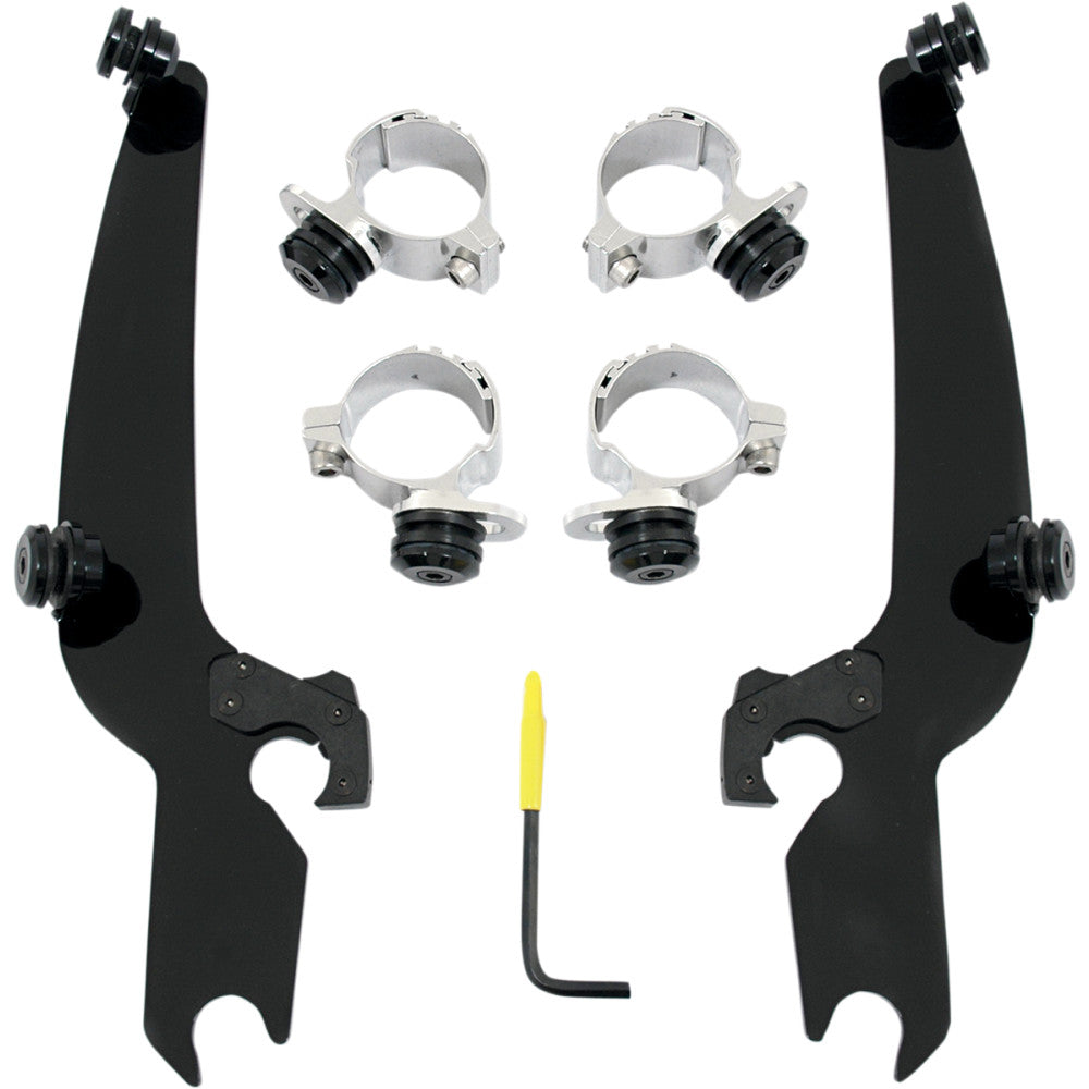 The revolutionary No-Tool Trigger-Lock mounting kits feature a detach system that allows you to quickly and easily remove or swap out your Sportshield without the use of any toolsA pair of latches lock the windshield down until the spring loaded "trigger locks" are intentionally disengaged, allowing the rider to remove the windshieldKits are a combination of CNC-machined aluminum plates and anchors, stainless steel hardware, gray polymer bushings and glass-filled nylon latches or "Night Shades" black version which, is a gradient black windshield with black E-coated stainless steel straps, fittings and hardware for a black-on-black sinister lookKits are custom-fit to each style of bike for no-hassle installationSpecifications