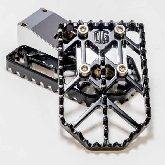 - Plataforma de agarre de acero inoxidable estilo motocross disponible en acabado en polvo crudo o negro