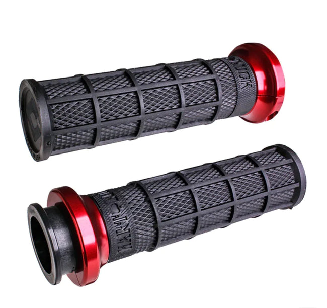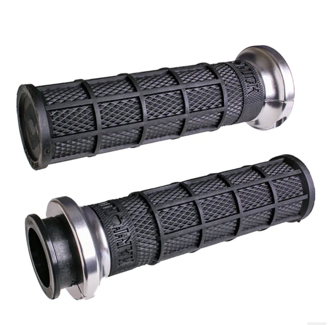 Ce design Full-Waffle inspiré de la moto a été développé pour offrir un confort amélioré en réduisant les vibrations tout en offrant une adhérence, une traction et un contrôle exceptionnels dans des conditions de conduite difficiles. La véritable technologie Lock-On d'ODI a été utilisée pour fournir le système de montage le plus sécurisé tout en permettant une installation et un retrait faciles. Chaque ensemble est fabriqué avec un tube d'accélérateur moulé spécifique à votre modèle. Le système de serrage éprouvé en billette d'aluminium est disponible dans des couleurs anodisées pour correspondre aux composants de votre construction personnalisée. Profitez de la bonne balade.