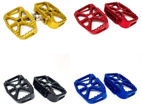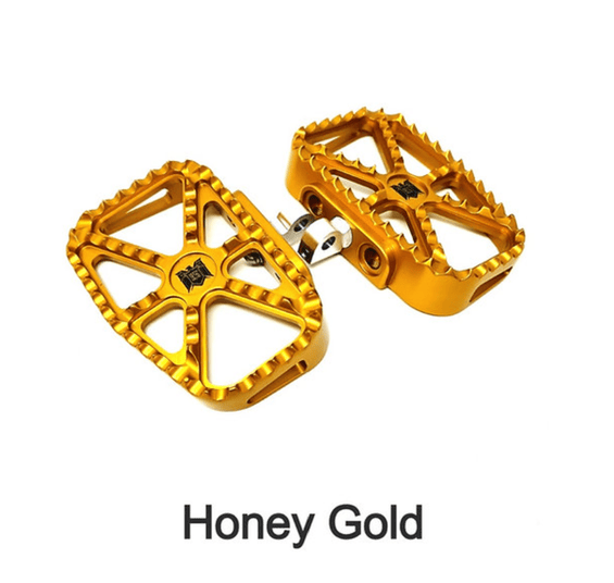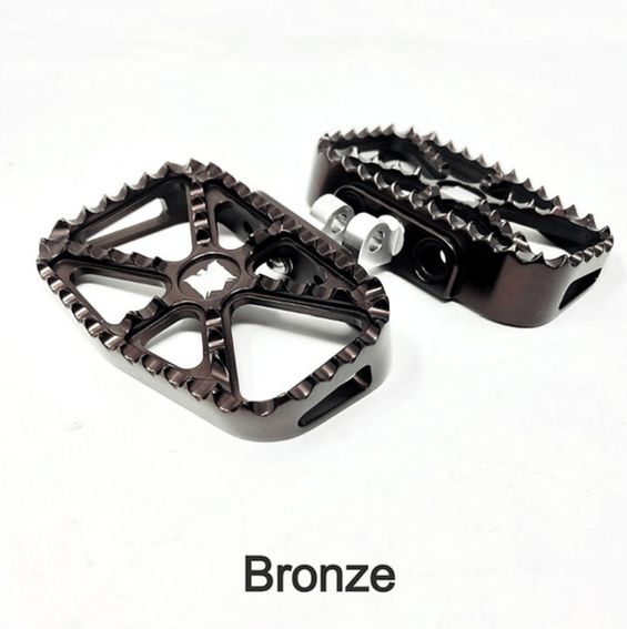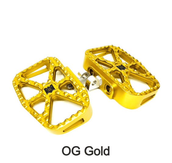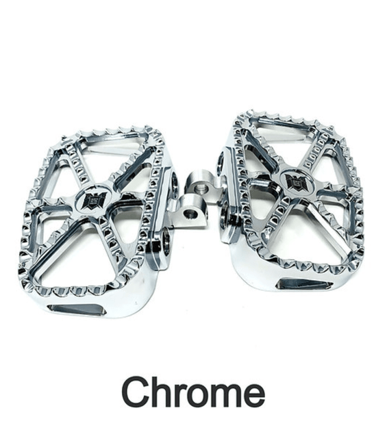Style BMX avec cette poignée agressive et antidérapante. Usiné à partir d'aluminium usiné, 3 réglages vers l'avant ou vers l'arrière avec chape réglable à 360 degrés en billette 7075 avec vis de réglage de verrouillage et vis de réglage à l'extrémité de la chape pour ajuster l'angle de la cheville (chape de montage mâle Harley standard uniquement). Logo gravé au laser. 3-3/4" de large sur 6" de long. Peut être utilisé pour les repose-pieds conducteur ou passager. Sur les modèles Bagger, ceux-ci peuvent être utilisés comme repose-pieds passager si vous disposez de supports de repose-pieds arrière. Avec les supports de chevilles Bagger de style court, la mini-carte frappera le couvercle latéral une fois repliée, et avec les supports de chevilles courts, elle peut également toucher le primaire.