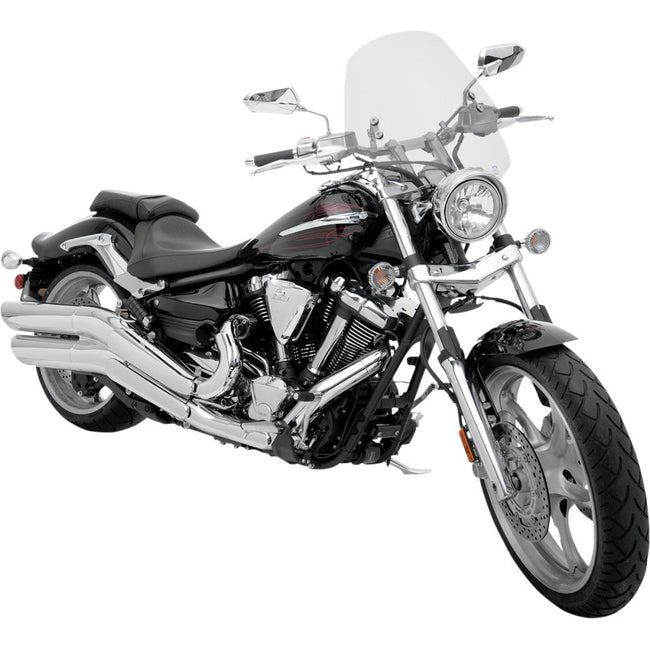 Included two-point mounting hardware consists of polished billet aluminum handlebar clamp that fits 1" and 7/8" handlebars (with sizing band), aluminum rake plates and bushings, stainless steel support rods and socket-head screws