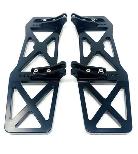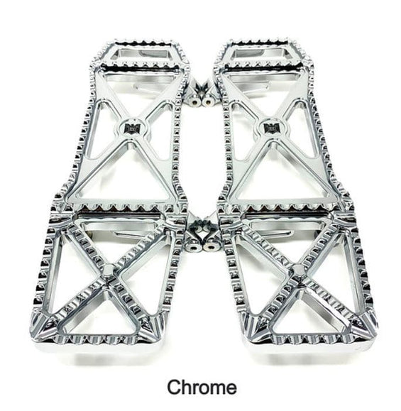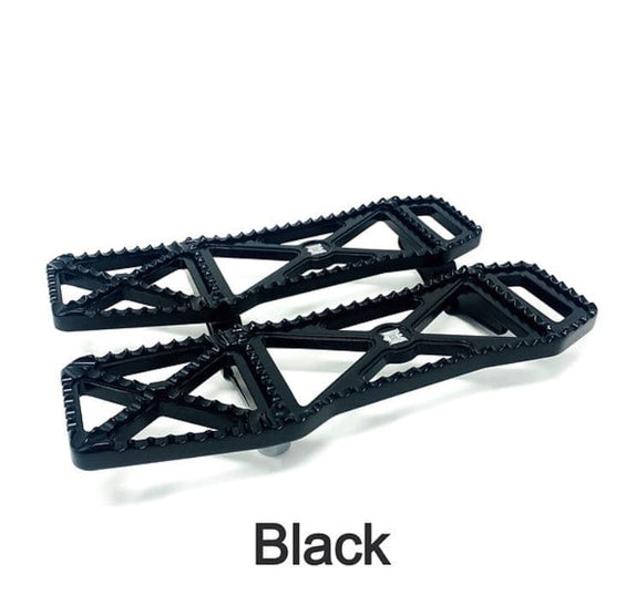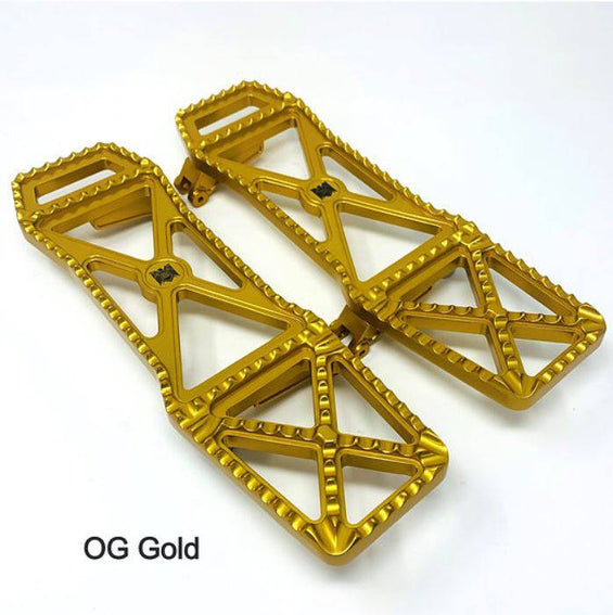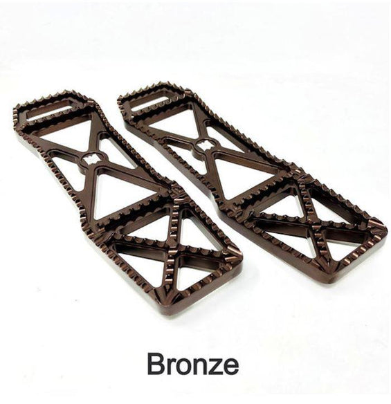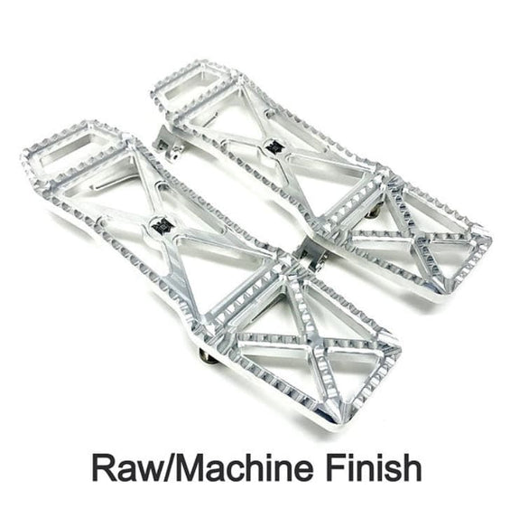 Usiné à partir d'aluminium 6061 T-6. Entièrement réglable à l'intérieur et à l'extérieur du vélo, vis de réglage dans chaque support pour régler l'angle des planches de plancher pour un dégagement et un confort maximum. Les planches de plancher mesurent 14-7/8" de long, 4-1/2" dans la partie la plus large et 3-3/4" de large dans la section centrale. Environ 3" de plus qu'une planche de plancher d'origine pour offrir plus d'options pour la position des pieds et une sensation de contrôle plus intermédiaire. La partie arrière est inclinée vers le haut pour la garde au sol.