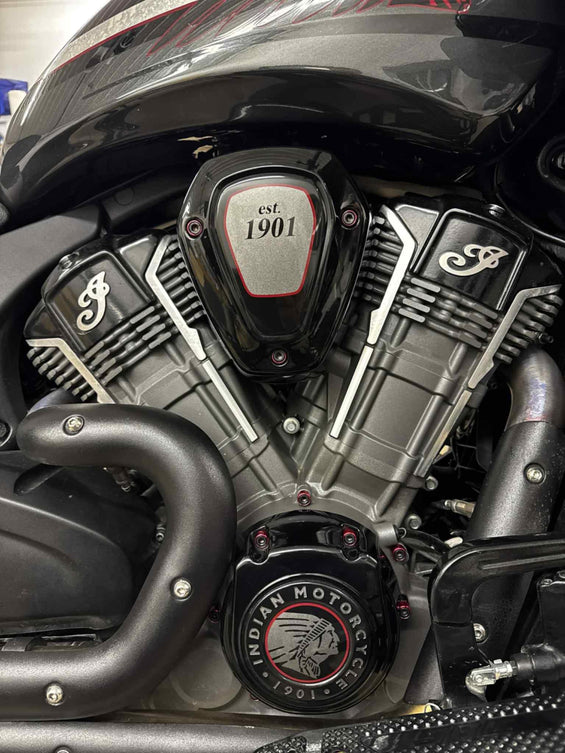 Les Chachos s'adaptent à tous les moteurs M-8, Twin Cam et EVO. Le kit de boulons de moteur en billette comprend des chachos pour le primaire, le derby, la came, le couvercle latéral de transmission, le couvercle de transmission, les blocs de levage, la boîte à bascule et la trappe.