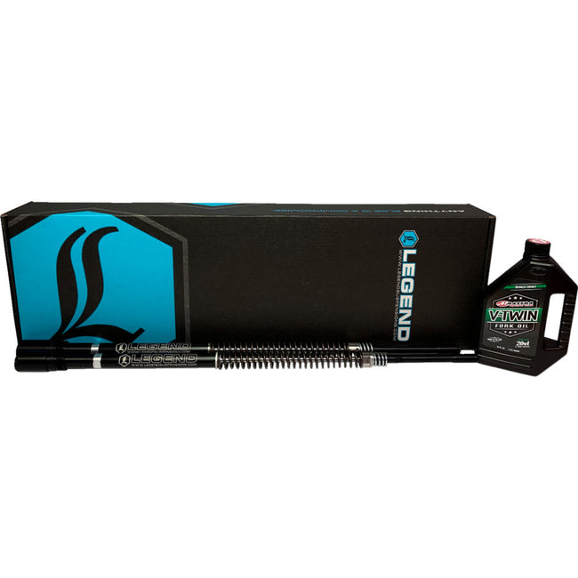 Innovative through shaft design is first of its kind in front fork application, not like others offering spring drop in or nitrogenEasy installationIncludes two mono-tube damper cartridges and two top out springsUnique through shaft technology so there is no rod pressure at the end of the strokeUtilizes a two-stage management system controlling fluid flow and high pressureCompression and rebound flow rates are managed via a high-flow damper piston and deflective disc setSecondary high pressure control system, using precision load rated wave springs, allows spike overpressure to bypass, protecting the deflective discs precision valve opening limitsThrough shaft eliminates the rod pressure in-and-out issues plus piston rod is always in fluidTwo precision linear bearings support both sides of the rod and piston assemblyProprietary performance main springMachined 303 stainless threaded preload adjusterIncreased pre-load range allows fine tuning for various riding styles and weights5 of travelRide quality is smooth and controlledImproves stability, cornering, and tractionEliminates front-end dive during aggressive braking and maneuveringFirm feel for high-speed sweeping turnsEliminates bottoming out on large bumps or potholesReduces dragging pegsDesigned for optimum performance with Legend rear suspension systemMaintains stock hydraulic bump stopLifetime WarrantyMade by hand in Sturgis, SD USAP65 WARNING: Cancer and Reproductive HarmSpecifications